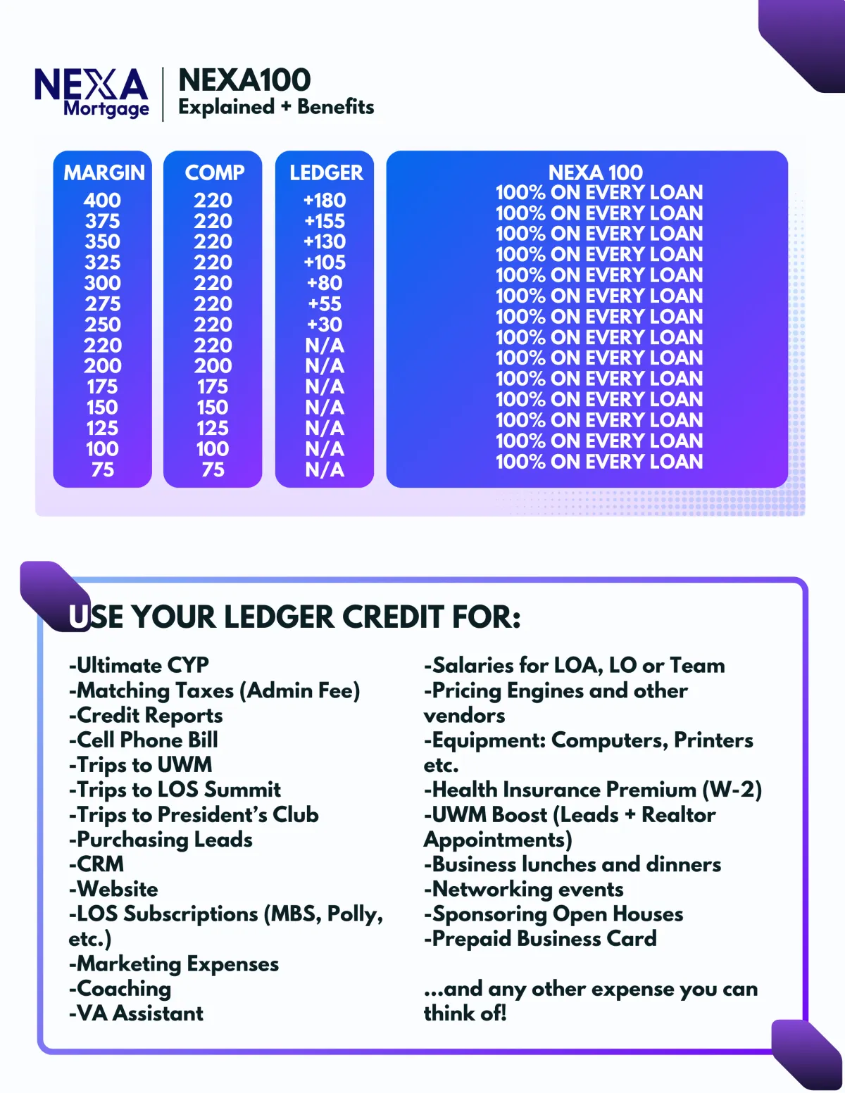 Earn up to 100% commission with no brokerage fees with certain lenders- Yep you heard that right! Nexa 100 was just rolled out and will make a huge impact in the Industry!